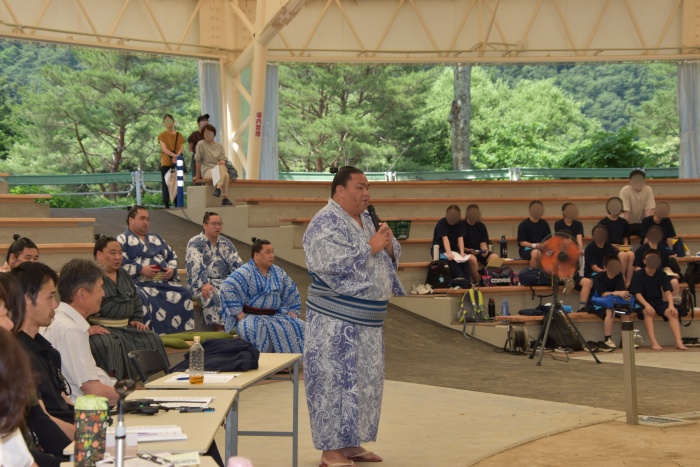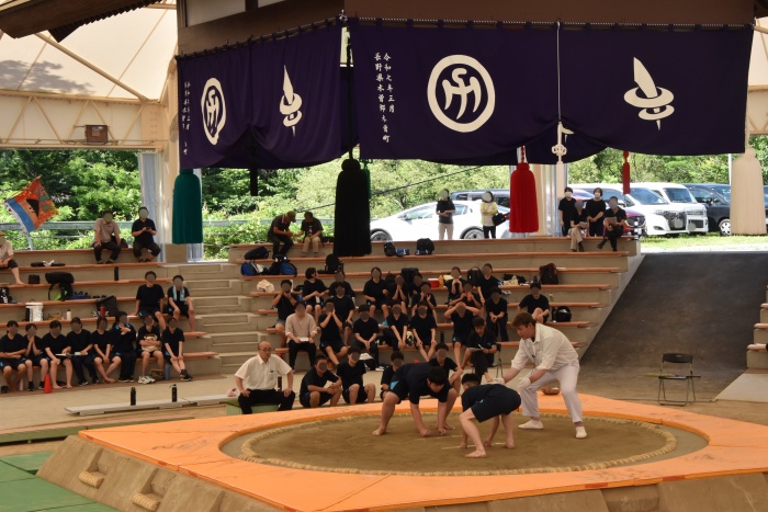 木曽合宿2日目、12時30分からは木曽町相撲場で中学生相撲大会が開催され、高崎親方、御嶽海関を始めとする力士も見学、協力しての貴重な時間となりました。